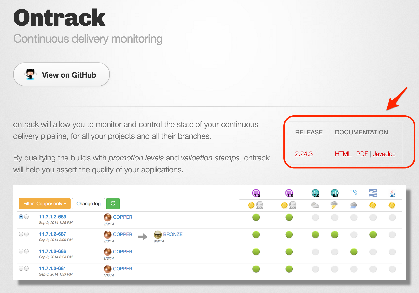 Ontrack documentation is now available per release on the project page at http://nemerosa.github.io/ontrack/: