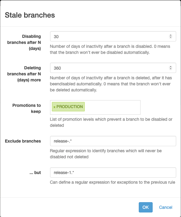 Stale branches policies, additionally to the activity since last build, now support include/exclude regular expressions to protect branches: