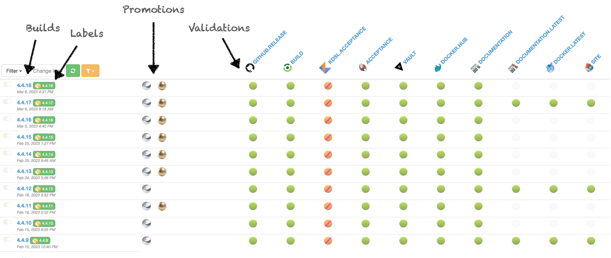 Pipeline after pipeline, validation after validation, you start adding more and more promotions to your builds (which look more and more like actual release candidates).