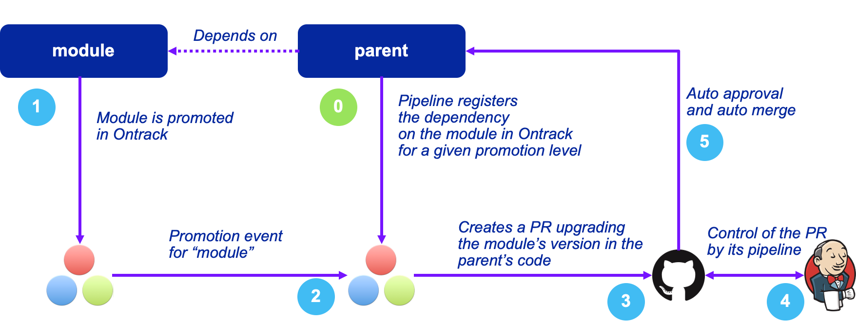 (4) the pull request is automatically controlled (business as usual) by its pipeline and upon success (5), this pull request is merged automatically, leading to an effective upgrade of the module into the parent.