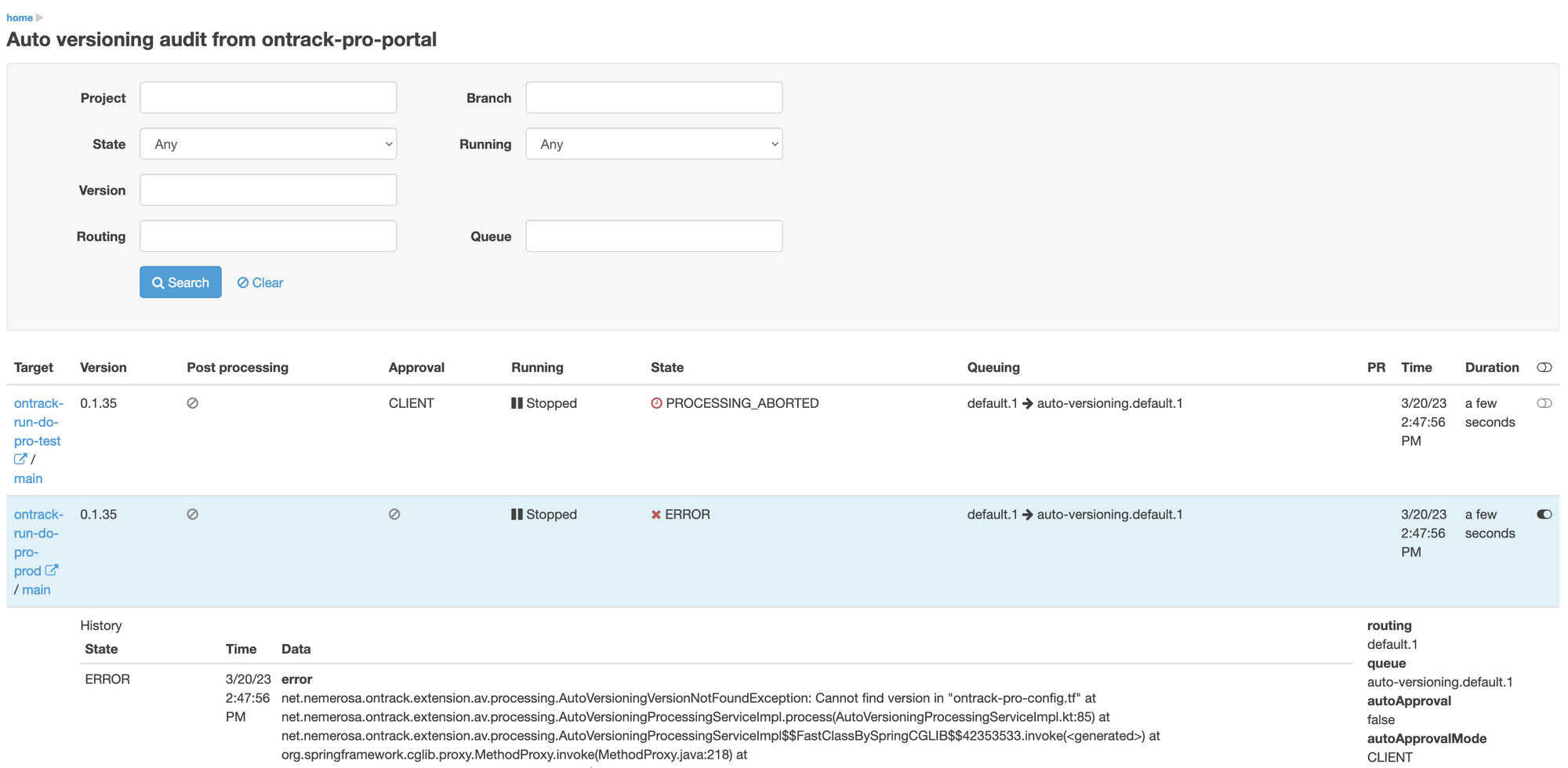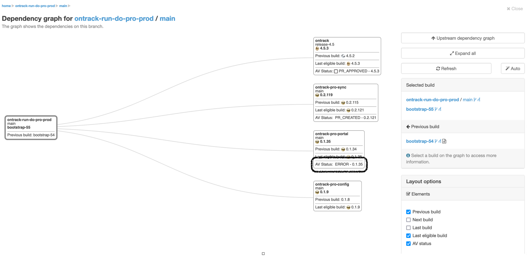 We see here some different components of the deployments, including one called ontrack-pro-portal where its auto versioning is marked as being errored.